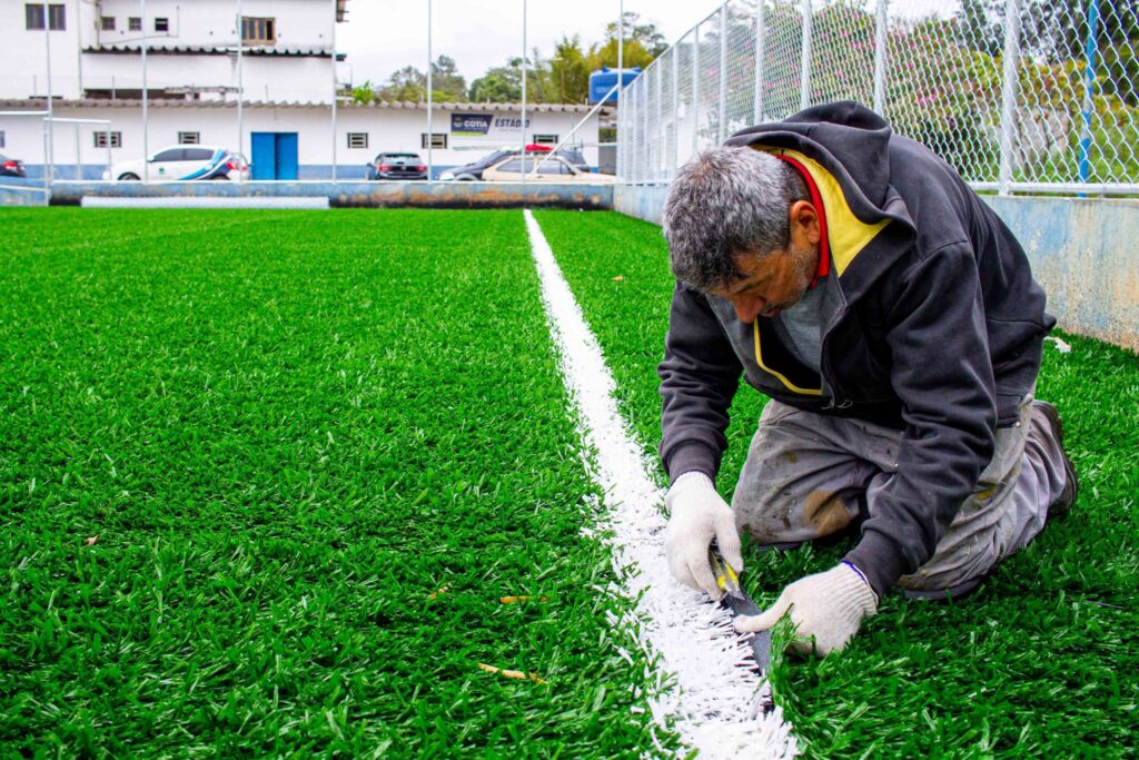 Com a base pronta, começa a instalação da grama em si. Essa etapa exige precisão e técnica.